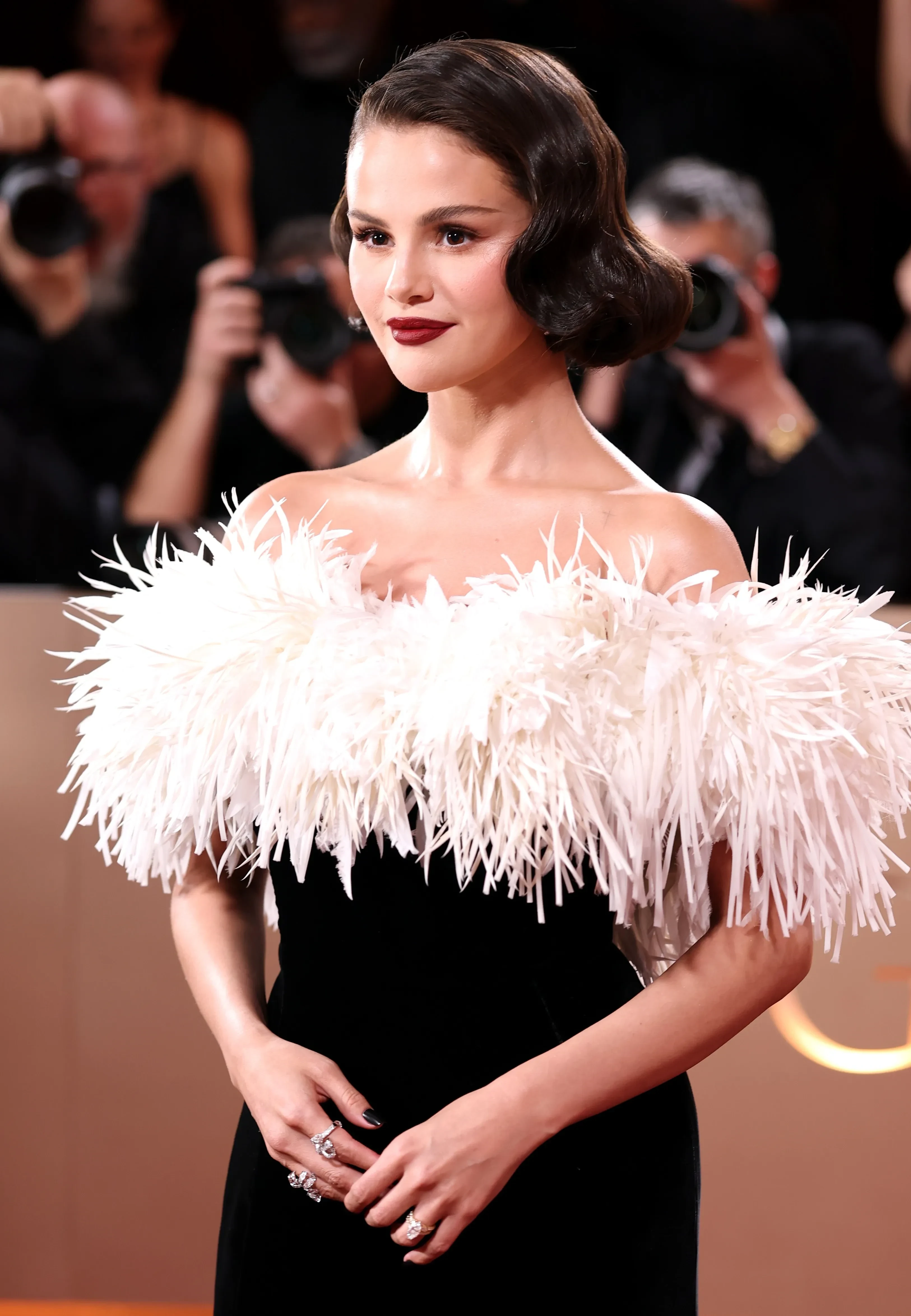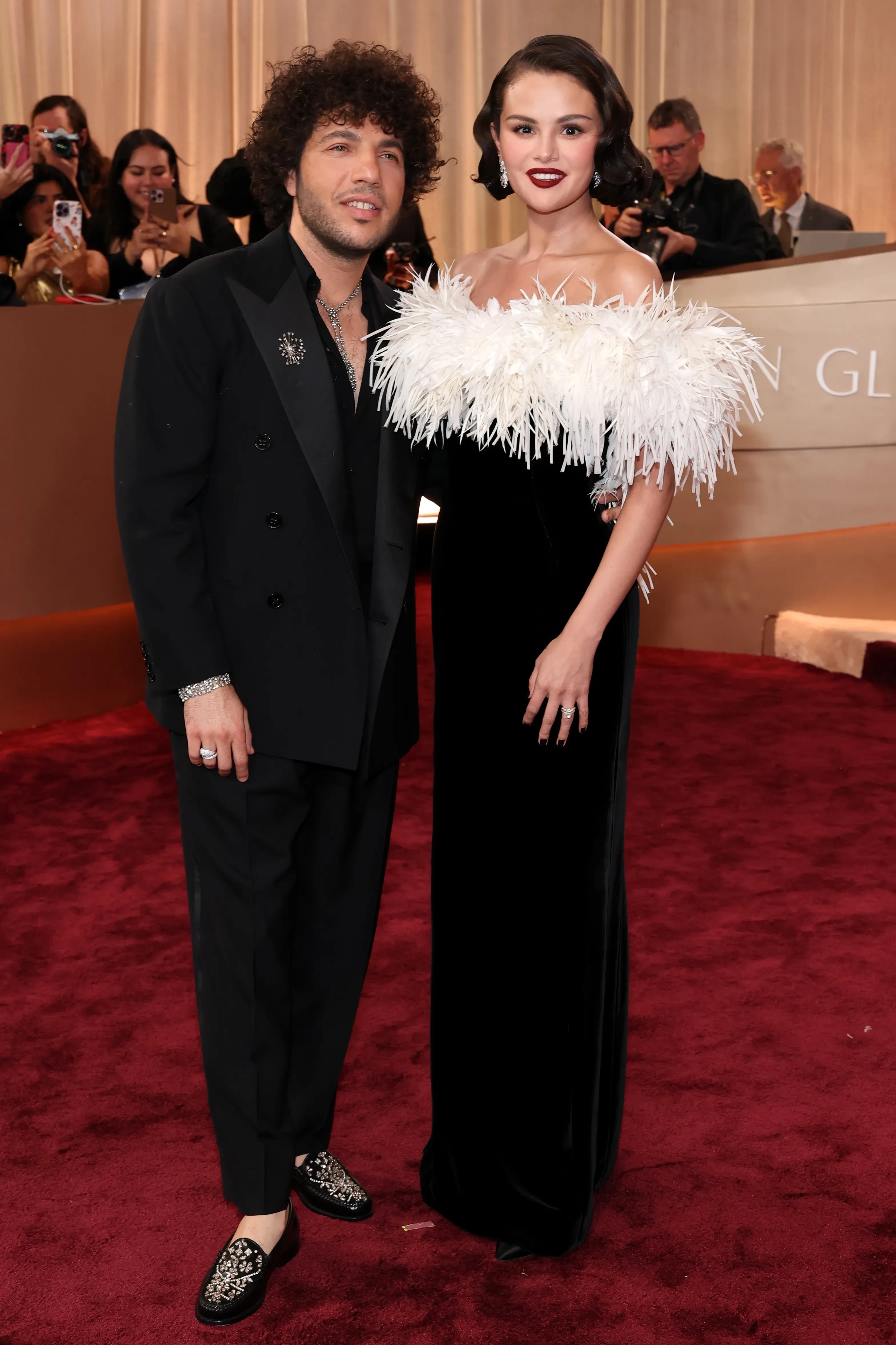 33-летняя Селена Гомес вышла на дорожку в образе старого Голливуда: она позировала в чёрном платье Chanel с перьями, дополнив образ тёмной помадой и ювелирными украшениями. 37-летний продюсер Бенни Бланко надел чёрный костюм и мокасины.
