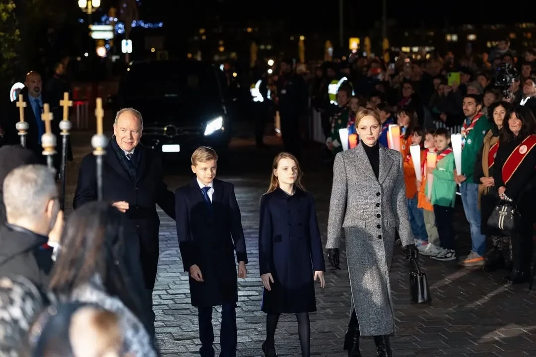 48-летняя княгиня Шарлен для выхода в свет выбрала серое пальто и чёрные кожаные перчатки, дополнив образ сумкой в тон. 11-летние принц Жак и принцесса Габриэлла, а также князь Альбер надели тёмно-синие пальто.