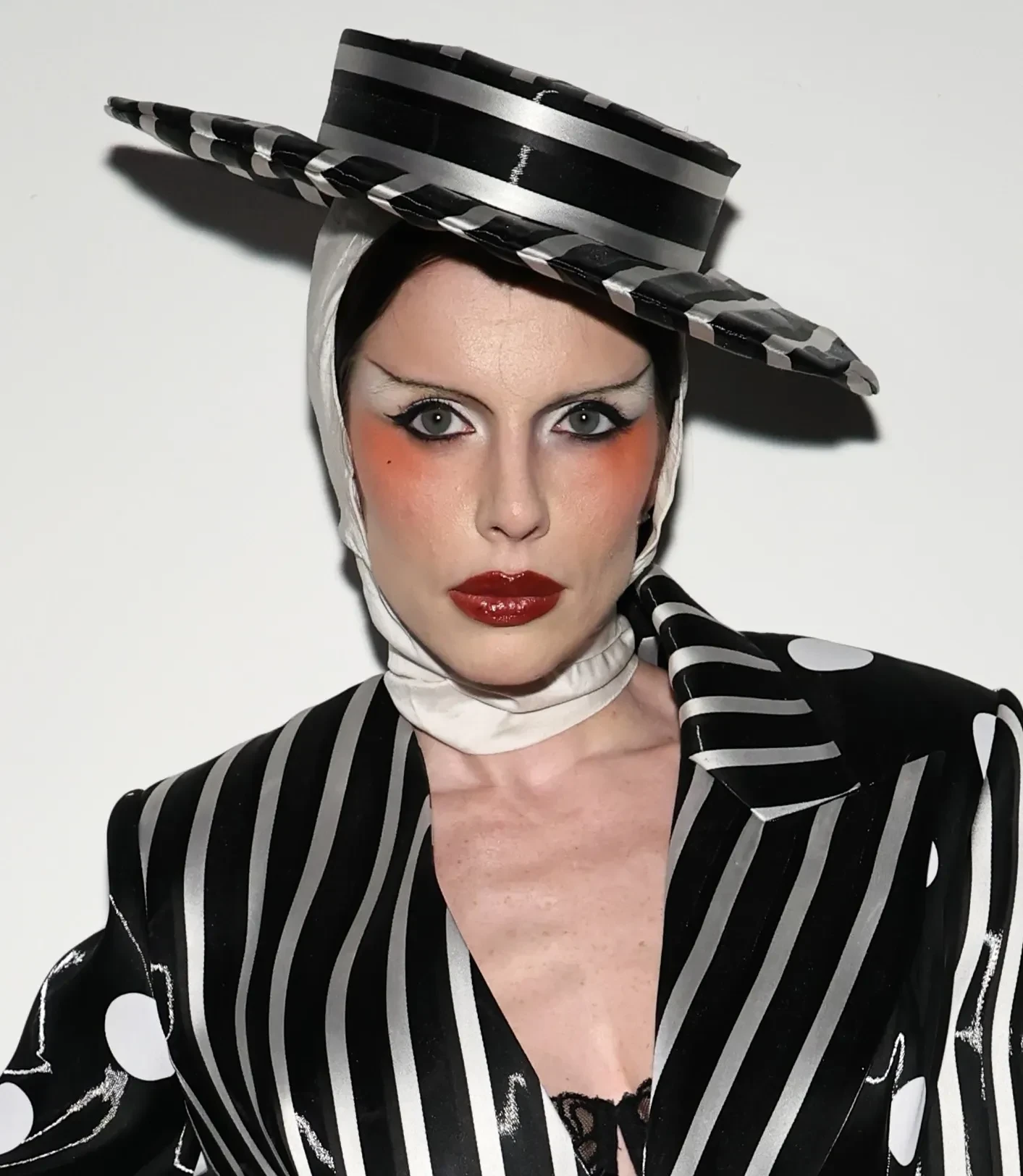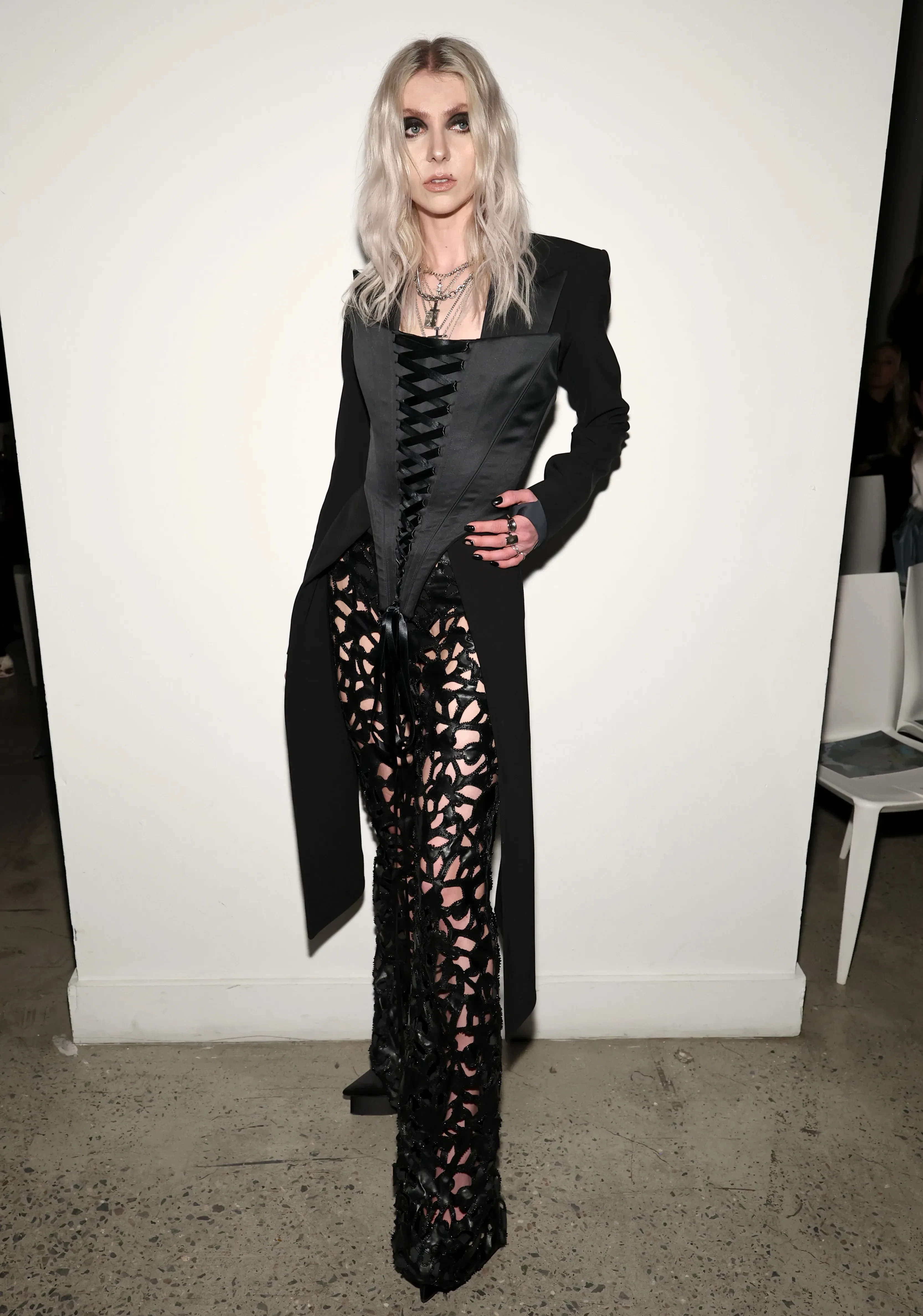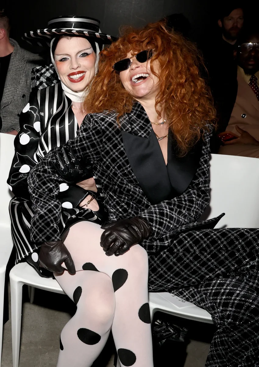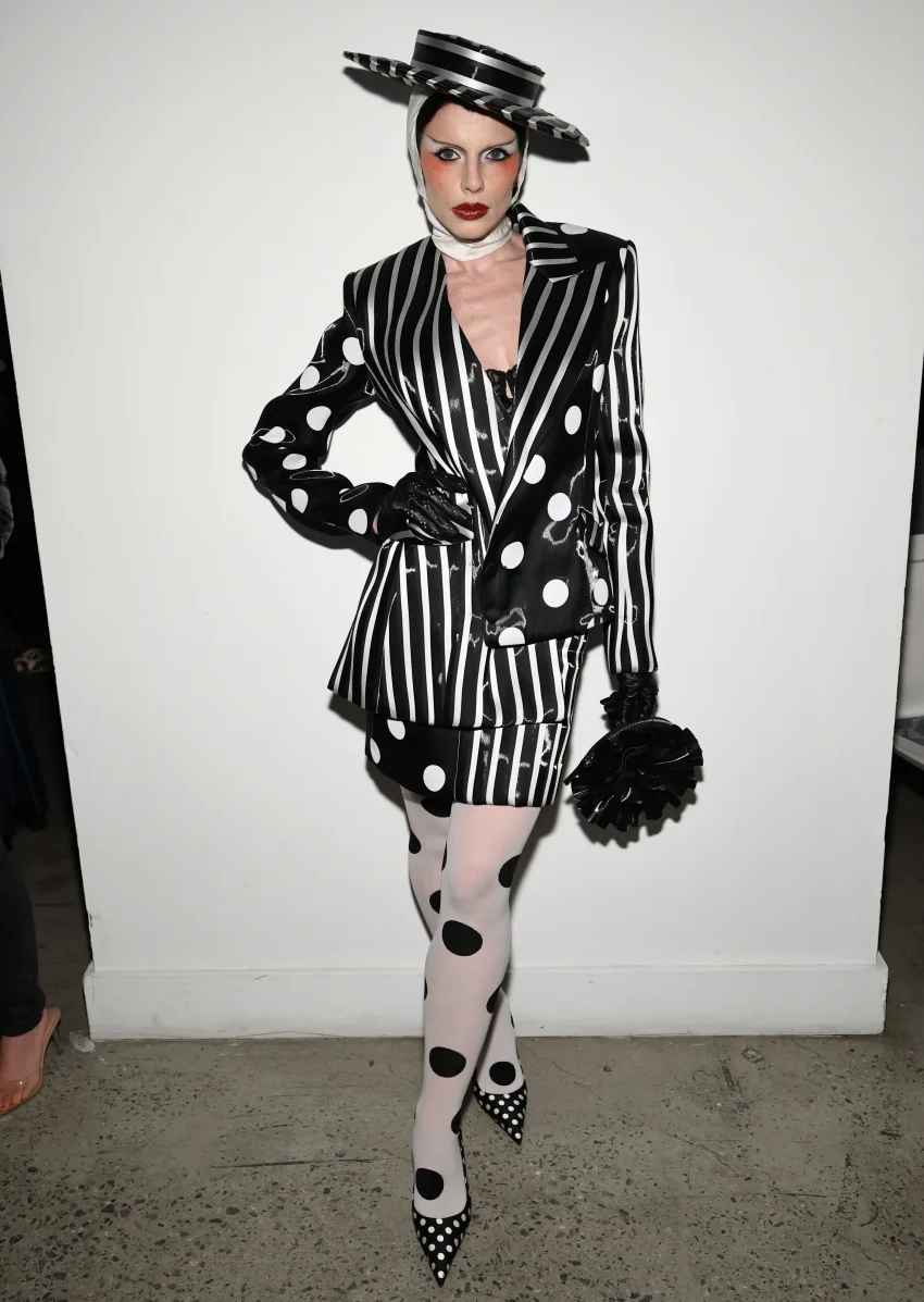 46-летняя Кейт Хадсон позировала в лиловом платье и шубе, а 35-летняя Тейяна Тейлор надела красное кутюрное платье Tamara Ralph. Любительница необычных образов Джулия Фокс пришла на показ в чёрно-белом костюме в полоску и горошек.