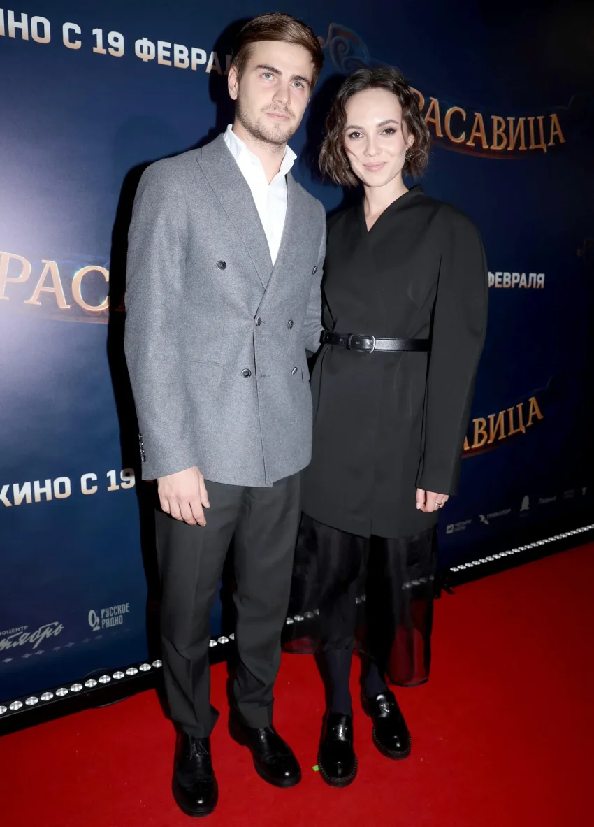 Стася Милославская позировала на дорожке в чёрном жакете и прозрачной юбке, а её возлюбленный пришёл в белой рубашке, сером пиджаке и брюках в тон.