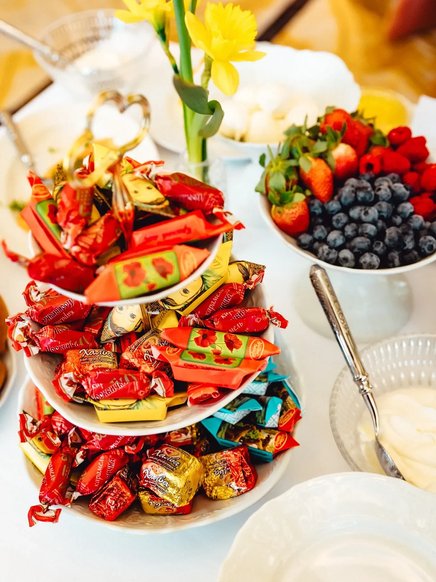Праздничным дресс-кодом стали образы в жёлто-белой цветовой гамме, напоминающей о нарциссах, которыми было украшено всё пространство. Столы ломились от угощений: наряду с традиционными блинами и оладьями присутствующих угощали пирожками с мясом и капустой, соленьями, шоколадными конфетами и петушками на палочке, которые предлагали запивать травяным чаем и настойками.