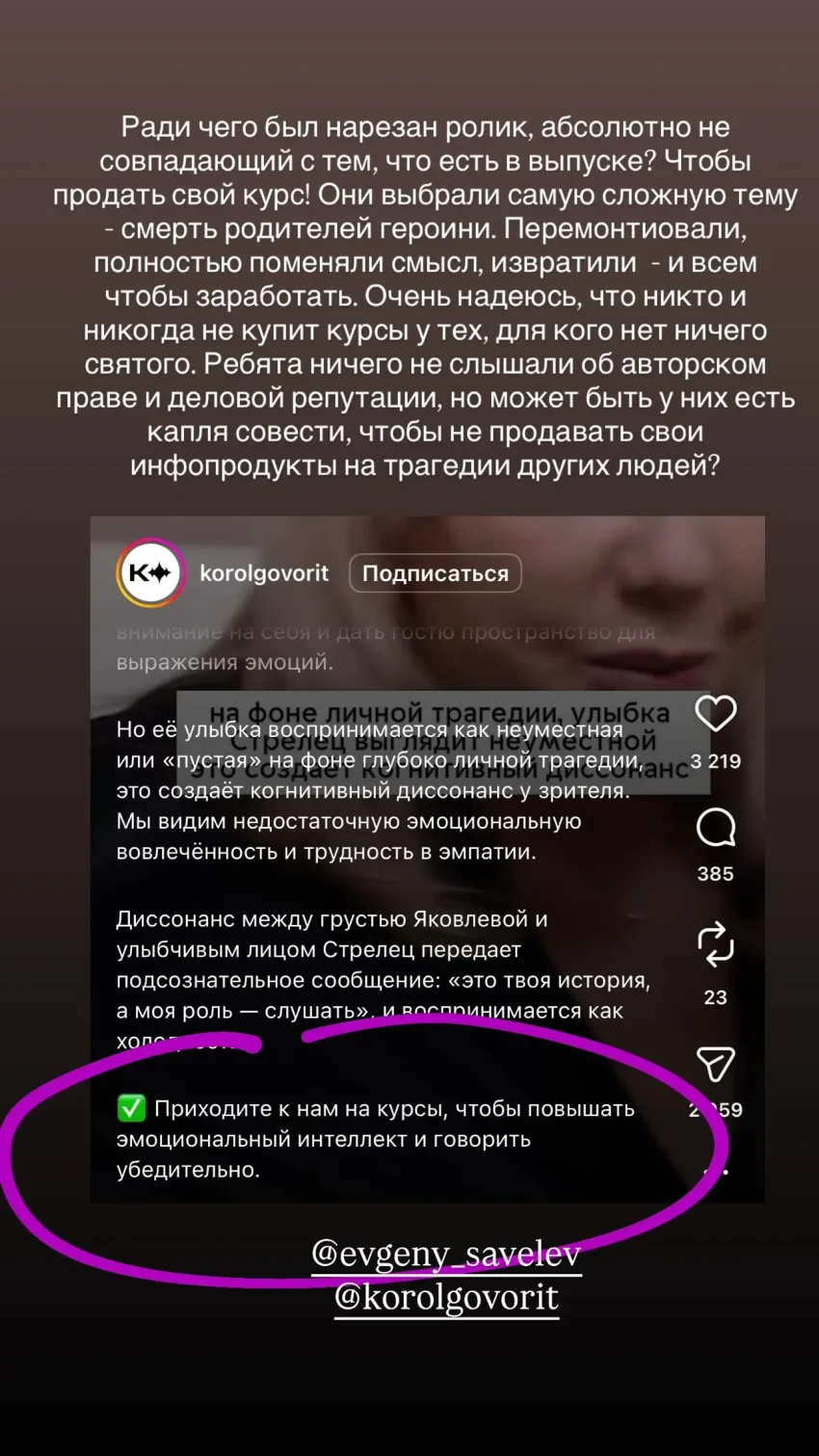 Надежда Стрелец, отрывок из видео в аккаунте школы "Король говорит""Для этих ребят нет ничего святого: взята была тема смерти родителей героини моего последнего интервью. Этот отрывок извратили и опошлили, создали хайп, устроили травлю в мою сторону, — и всё, чтобы продать свои курсы".