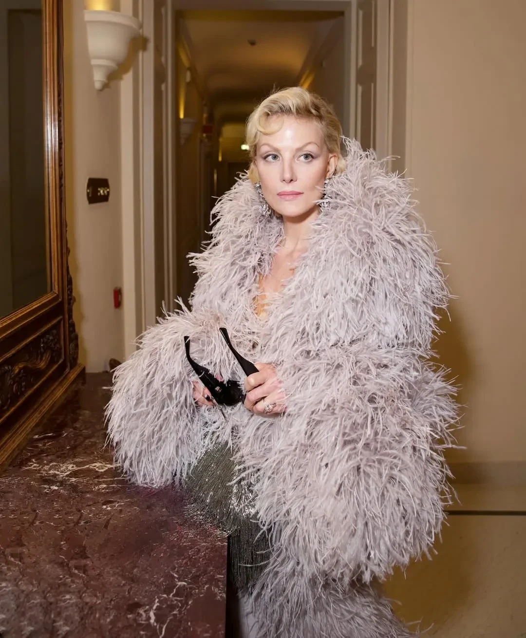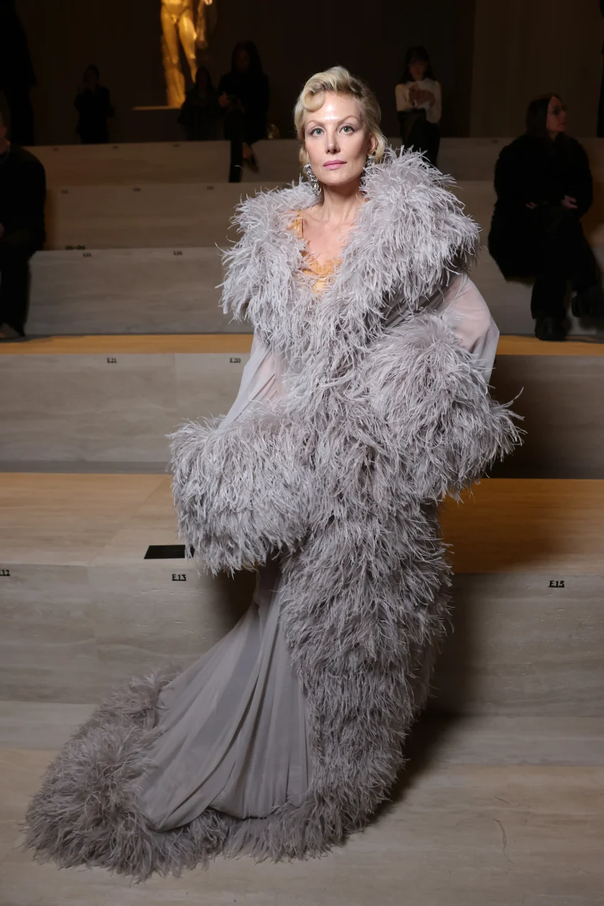 Литвинова отправилась на шоу в длинном платье Gucci с перьями. Образ дополнили серебристая сумка с бахромой, массивные серьги с бриллиантами и солнцезащитные очки.