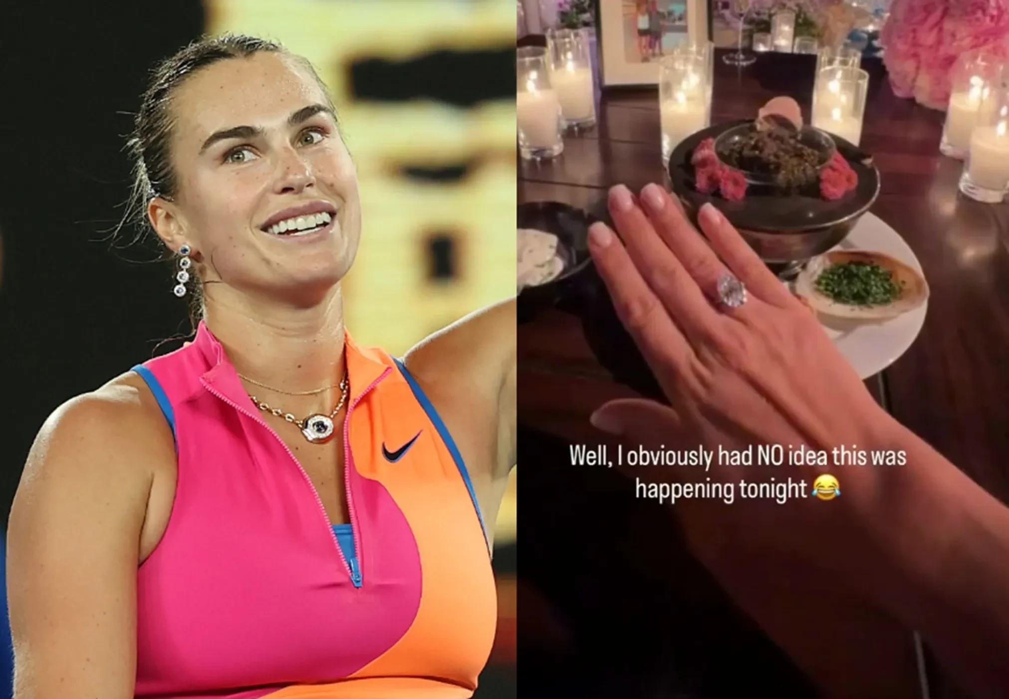 "Ты и я навсегда", — подписала видео Соболенко. В сторис* она также показала помолвочное кольцо с крупным бриллиантом и пошутила, что "конечно же, понятия не имела о том, что произойдёт сегодня вечером" — намекая на свой идеальный маникюр.