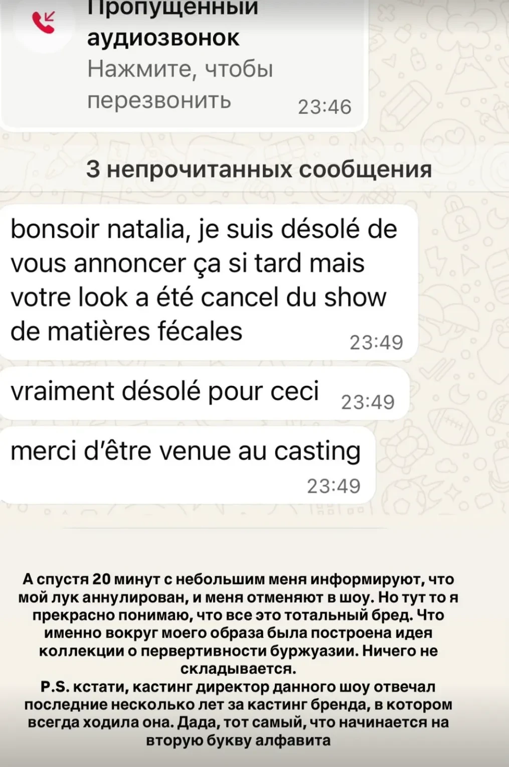 Подтверждение участия Натальи Максимовой в шоуБуквально через 20 минут после письма с подтверждением Наталье приходит сообщение о том, что её участие в шоу аннулировано. Она назвала эту ситуацию "тотальным бредом", потому что якобы вокруг её образа построена идея коллекции о "первертивности буржуазии". Максимова также намекнула, что за наём моделей на показе отвечает тот же человек, который ранее работал в Balenciaga. "Кастинг-директор данного шоу отвечал последние несколько лет за кастинг бренда, в котором всегда ходила она. Да-да, тот самый, который начинается на вторую букву алфавита".