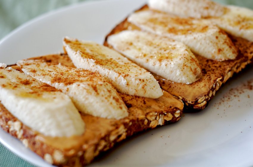 - тост из цельнозернового хлеба с арахисовым маслом, нарезанным бананом и корицей;