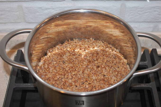 - Если крупа не обжаренная, ее можно слегка подсушить.