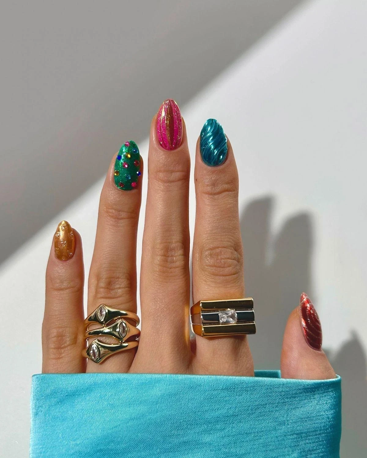 В отличие от классических трендов, здесь нет строгих правил. Вместо универсального нюда — насыщенные цвета, блеск, необычные текстуры, игривые детали и дизайны, которые ассоциируются с радостью, праздником и ощущением игры.