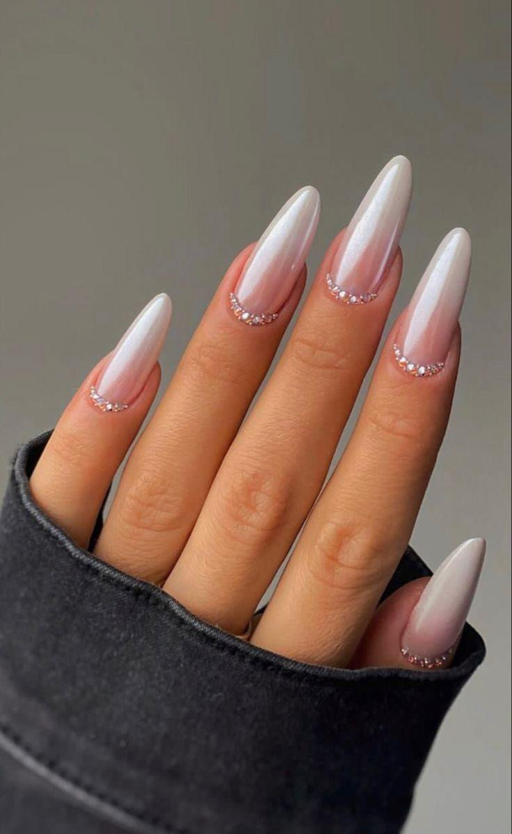 Миниатюрные кристаллы, словно капли росы, размещаются на ногтях в хаотичном порядке. Этот маникюр уместен для вечерней свадьбы, особенно в тандеме с блестящими тканями, пайетками или фатином. Эффект особенно выразителен при свете свечей или фотоспышки.
