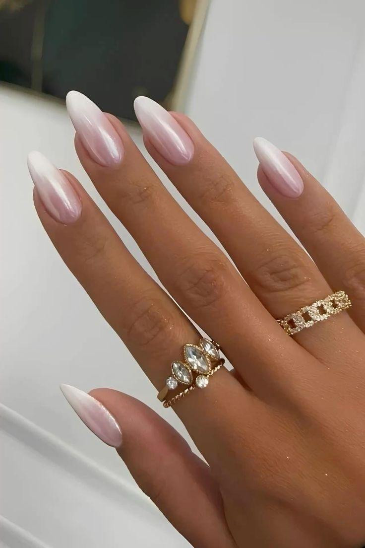 Плавный переход от молочного к бежевому или розовому напоминает легкую дымку. Такой маникюр добавляет объёма и визуальной легкости, а на овальных или миндальных ногтях смотрится особенно изысканно. Идеален для романтических и пастельных образов.
