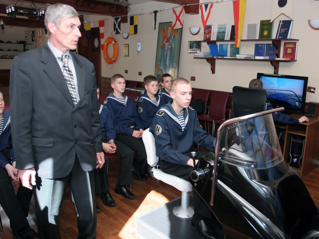 А годом ранее на базе «Андрея Первозванного кадетского морского корпуса» проходил представительный симпозиум, где собрались руководители кадетских корпусов со всей России. В рамках одного из мастер-классов С.С.Родионов с группой кадет показывали, как идет обучение детей на тренажере SSH-2009. С помощью этого современного тренажера кадеты 7-9-х классов осваивают практические навыки управления маломерным судном в открытом море, в узкости, при спасении людей на воде, учатся безопасному расхождению со встречными судами, осваивают швартовку, заход и выход из порта, постановку на якорь. Кроме того, тренажер позволяет обеспечить наглядное представление об устройстве корабля, помогает в изучении классификаций кораблей и судов ВМФ, индивидуальных и коллективных спасательных средств кораблей и судов. Естественно, на мастер-классе Сергей Степанович и гостям корпуса предложил позаниматься на этой чудо-машине. Но пошел на педагогическую хитрость: не сам помогал коллегам-преподавателям, а приставил к ним детей. Заслуженные педагоги были приятно удивлены, когда юнги со знанием дела давали дельные советы по швартовке и навигации. А кадеты, услышав восхищенные возгласы взрослых, буквально расправили крылья: «плавали, знаем»!