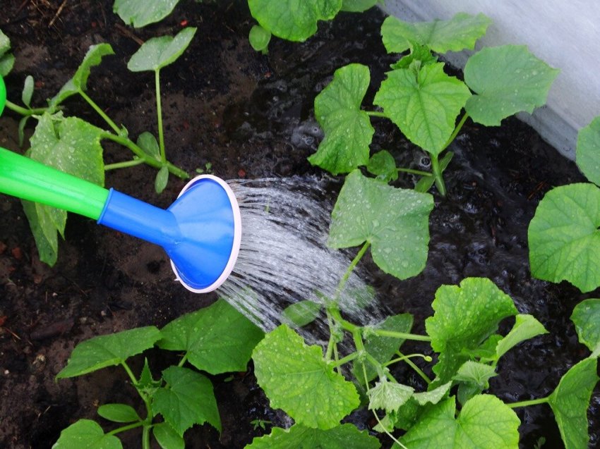 Поливать огурцы можно не только под корень, но и по листьям — так называемое дождевание. Оно повышает влажность воздуха вокруг растений, что особенно важно в жару.