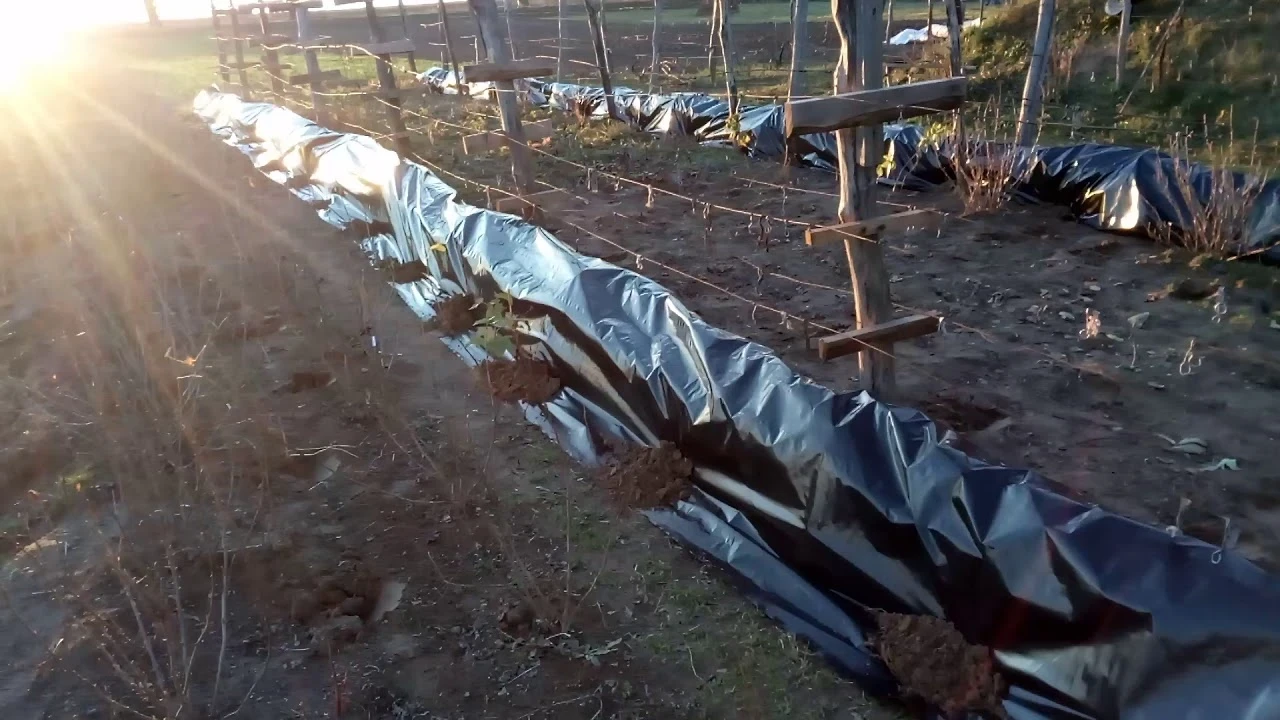 Лозу пришпиливают и засыпают земляной горкой (1 см = 1 °C защиты).
